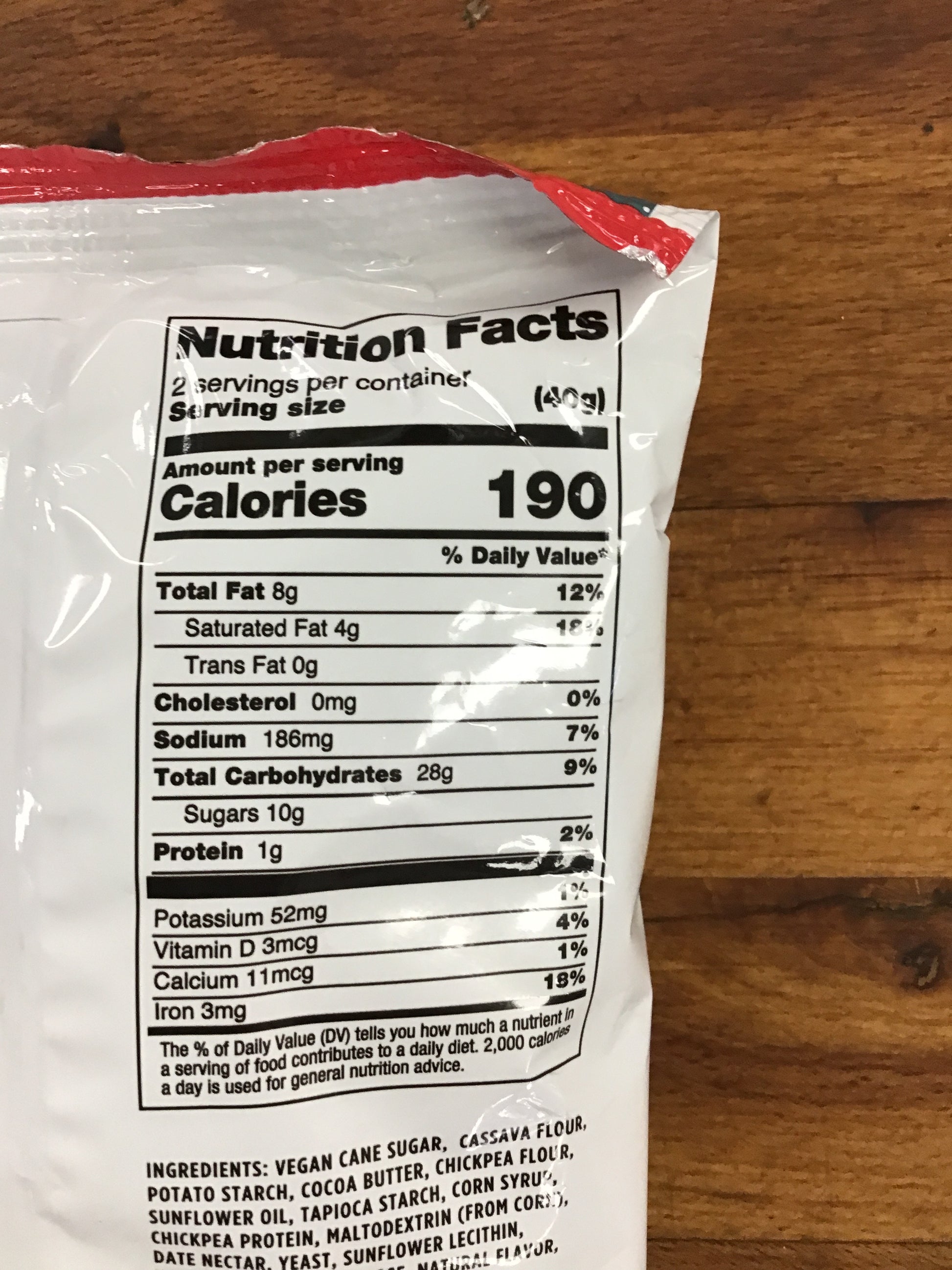 Ingredients: Vegan Cane Sugar, Cassava Flour, Potato Starch, Cocoa Butter, Chickpea Flour, Sunflower Oil, Tapioca Starch, Corn Syrup, Chickpea Protein, Maltodextrin (from corn), Date Nectar, Yeast, Sunflower Lecithin, Natural Vanilla, Dextrose, Natural Flavour, Salt, Coloured With Vegetable Juice
