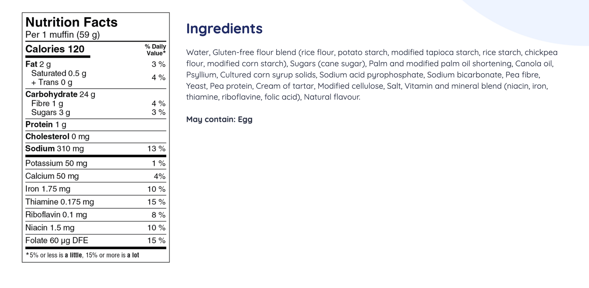 Ingredients: Water, Gluten-free flour blend (rice flour, potato starch, modified tapioca starch, rice starch, chickpea flour, modified corn starch), Sugars (cane sugar), Palm and modified palm oil shortening, Canola oil, Psyllium, Cultured corn syrup solids, Sodium acid pyrophosphate, Sodium bicarbonate, Pea fibre, Yeast, Pea protein, Cream of tartar, Modified cellulose, Salt, Vitamin and mineral blend (niacin, iron, thiamine, riboflavine, folic acid), Natural flavour.
